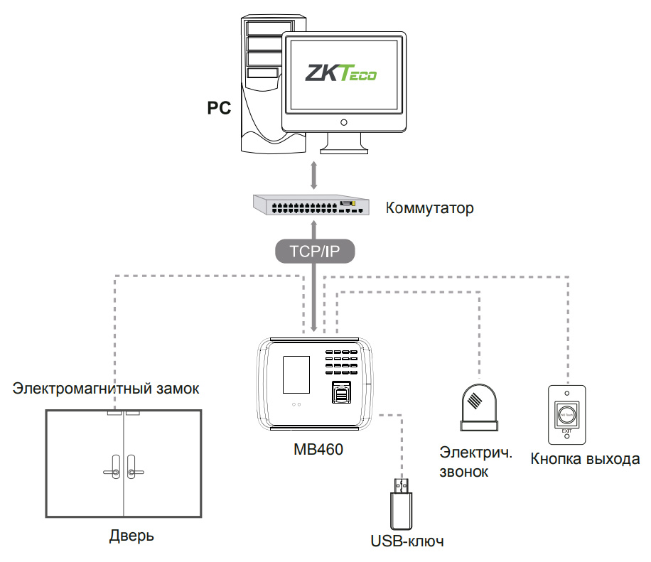MB460 — это инновационное устройствот с передовыми технологией распознавания отпечатков пальцев и лиц компании ZKTeco. Терминал поддерживает несколько методов верификации, включая лицо, отпечаток пальца, карту, пароль, их комбинации и основные функции контроля доступа. Верификация пользователя выполняется менее чем за 1 секунду, что упрощает процесс доступа. Связь между MB460 и ПК осуществляется через интерфейс TCP/IP или USB для ручной передачи данных. Стильный дизайн терминала идеально впишется в любую обстановку.