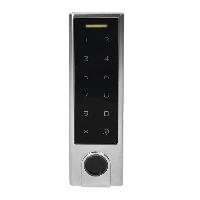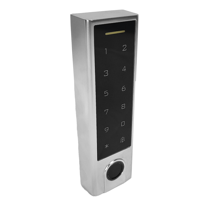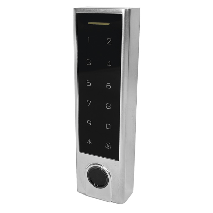 Кодонаборная панель пыле- влагозащищённая с классом защиты IP66, со встроенным считывателем отпечатков пальцев, считывателем идентификаторов форматов Em-marin, Mifare и автономным контроллером на 99 отпечатков и 988 карт/кодов и выходом Wiegand-26-44, 56, 58.