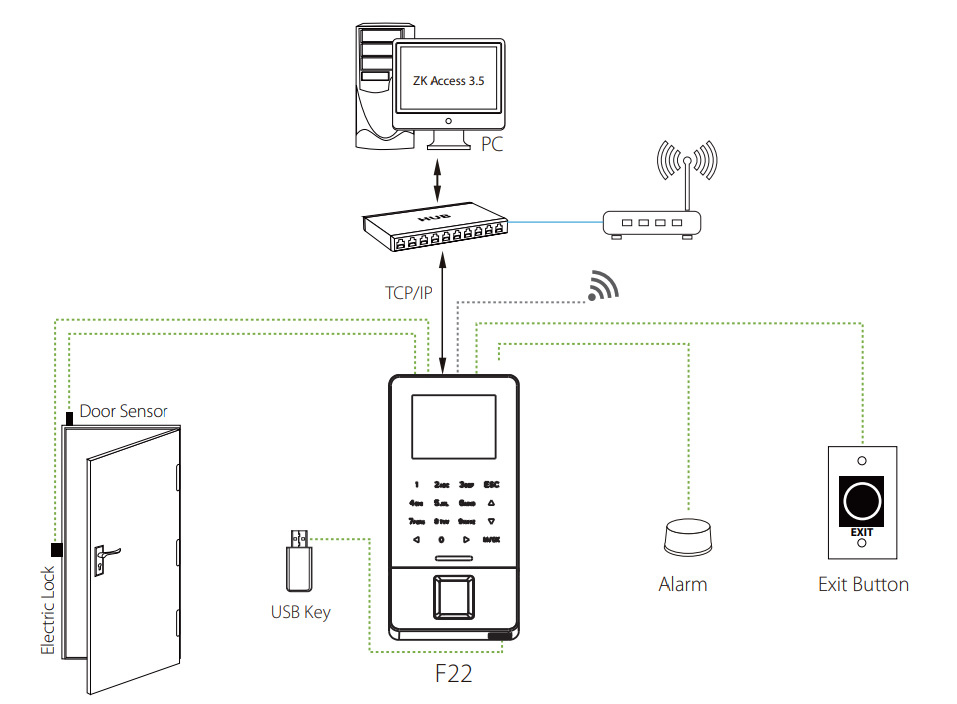 Биометрический терминал ZKTeco F22 имеет встроенный Wi-Fi модуль, с помощью которого подключение к сети может выполняться даже из удаленных уголков здания без необходимости прокладки кабелей. Также у устройства есть стандартные варианты подключения через TCP/IP или RS485, выход AUX. Имеется дополнительный вход для связи с пожарными датчиками или аварийным выключателем.