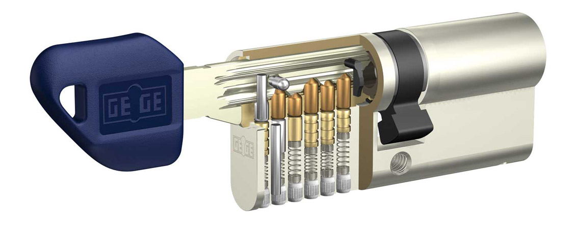 Используя проверенные компоненты (монолитный корпус, муфты и пины) цилиндры также оснащены дополнительными функциями безопасности. Новая и уникальная форма профиля ключа, „ветвистый паз“, производится с помощью специального наклонного фрезерования. Эта запатентованная технология обеспечивает дополнительную защиту от несанкционированного изготовления дубликатов ключей. Дополнительный активный контрольный пин предотвращает использование незаконно изготовленных ключей. Цилиндры Gege доступны с 5 (по умолчанию), 6 или 7 кодовыми пинами, что обеспечивает большое количество кодовых комбинаций при изготовлении мастер-систем.