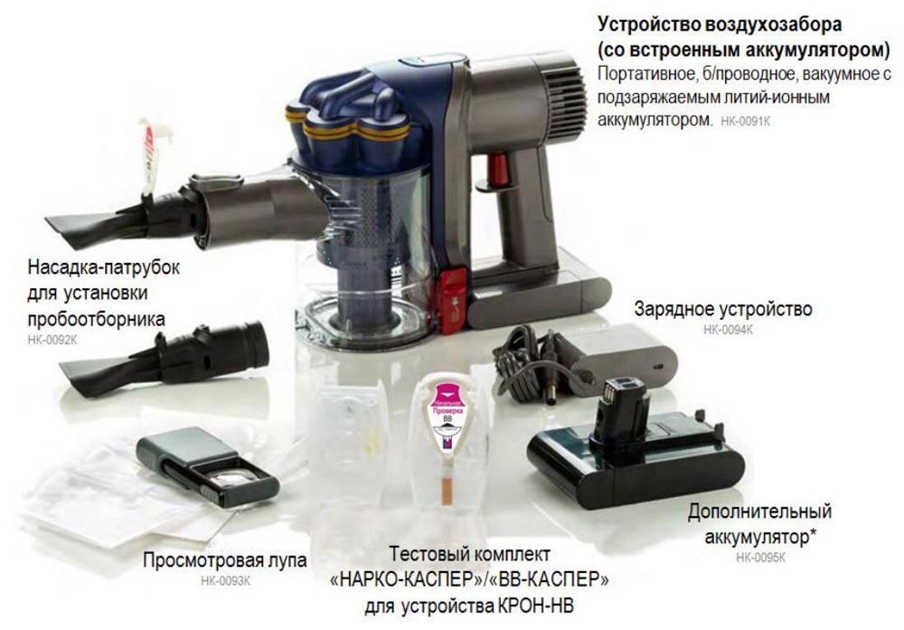 Устройство воздушного забора проб — «КРОН-НВ», имеющее возможность быстро, надежно и эффективно выполнять анализ наличия наркотиков и взрывчатых веществ. В состав тестов «НАРКО-КАСПЕР» и «ВВ-КАСПЕР» входят тестовые модули, предназначенные для применения в комплекте с устройством «КРОН-НВ» для воздушного забора проб, что позволяет выполнять сортировку и обнаружение даже небольших количеств и следов веществ на поверхностях или объектах любого типа. Устройство «КРОН-НВ» может быть использовано для обследования людей, одежды, посылок, автомобилей, самолетов, поддонов, контейнеров, больших поверхностей и т.п. Устройство является надежным, практичным и эффективным при решении задач, стоящих перед специалистами, ведущими борьбу с оборотом наркотиков и взрывчатых веществ.