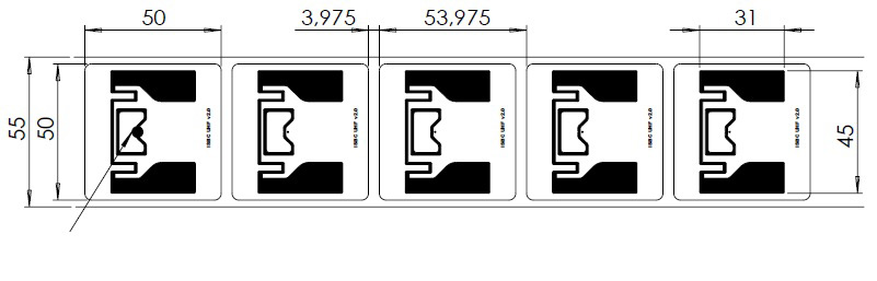 Метка представляет собой PET плёнку с установленным на ней оригинальным чипом UCODE8 от компании NXP, совмещенным с антенной размером 45х31 мм, сверху укрытую PET слоем адаптированным для печати на термотрансферном принтере. Снизу размещен клеевой слой, защищённый силиконизированной бумагой. Работает в частотном диапазоне UHF 865-868 МГц. Выпускается серийно на собственном производстве компании ISBC в г. Зеленограде.