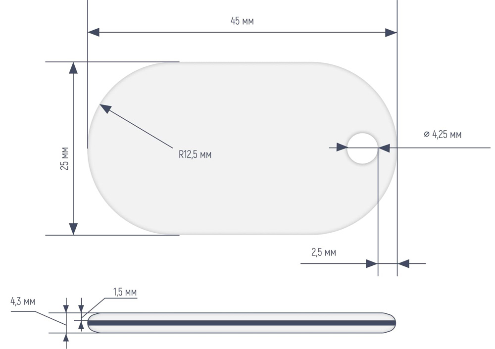 Размеры: 45 х 25 мм, толщина 4.3 мм. Диаметр отверстия 4.25 мм