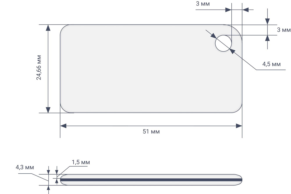 Размеры: 51 х 24.66 мм, толщина 4.3 мм. Диаметр отверстия 4.5 мм