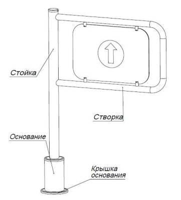 Все элементы конструкции калитки выполнены из шлифованной нержавеющей стали. Створка калитки крепится к стойке при помощи установочных винтов. Стойка вращается относительно неподвижного основания, прикрепленного к полу.