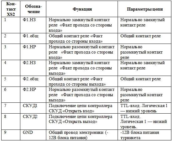 Подключение турникета к контроллеру СКУД осуществляется в соответствии с таблицей через разъем XS2 модуля IB v1.1.