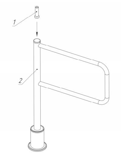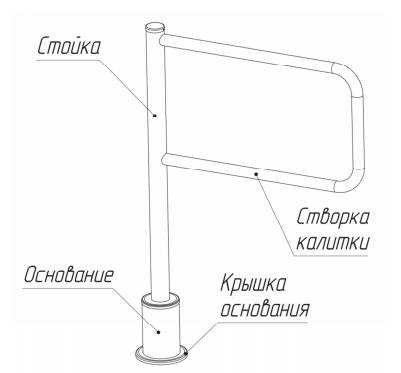 Все элементы конструкции калитки выполнены из шлифованной нержавеющей стали. Створка калитки крепится к стойке при помощи установочных винтов. Стойка вращается относительно неподвижного основания, прикрепленного к полу. Крепление к полу скрывает крышка основания.