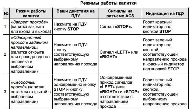 При импульсном режиме управления задание режимов работы калитки с ПДУ и их индикация осуществляется в соответствии с таблицей.