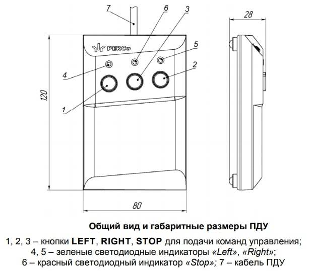 ПДУ (9) выполнен в виде небольшого настольного прибора в корпусе из ударопрочного АБС пластика и предназначен для задания и индикации режимов работы при ручном управлении калиткой. ПДУ (9) подключается к БУ (8) гибким многожильным кабелем (12) через кабельный ввод в нижней панели БУ.