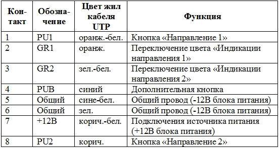Пульт представляет собой разборный пластмассовый корпус, состоящий из днища и крышки. На крышке расположены два светодиодных индикатора и трехкнопочный блок клавиатуры. Выкрутив четыре винта М3, расположенных по углам днища корпуса, можно снять крышку и получить доступ к электронной схеме ПДУ. В торце корпуса расположен разъем-розетка типа 8P8C для подключения интерфейсного кабеля. Для подключения к калитке оба конца кабеля обжимаются по стандарту EIA/TIA-568B. Цоколевка разъема и цвет жил интерфейсного кабеля приведен в таблице.