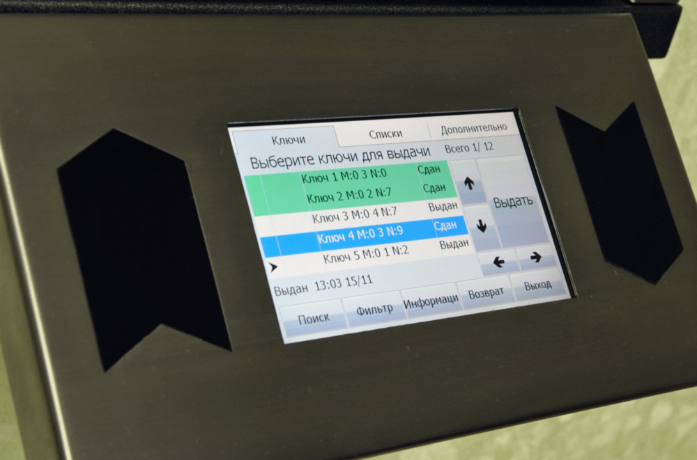 Большой сенсорный дисплей позволяет не только просто и легко управлять системой хранения ключей, но так же быстро получить любую интересующую Вас информацию. К примеру, кто и когда взял ключ или в какой ключнице на объекте находится данный ключ.