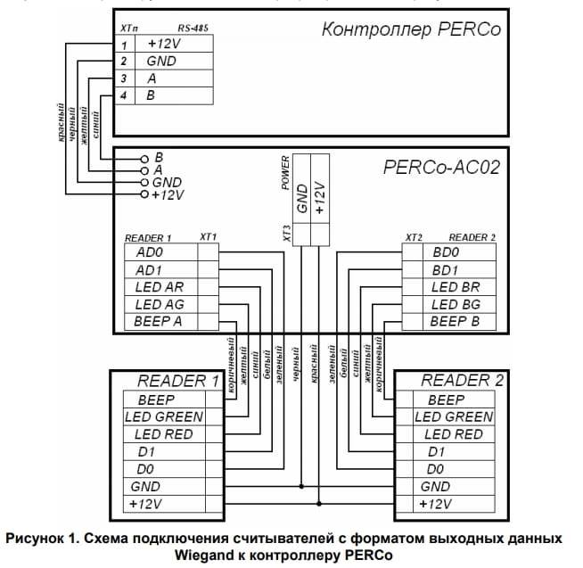 • Цвет проводов считывателей может отличаться от указанного на схеме (смотри документацию на конкретный считыватель).