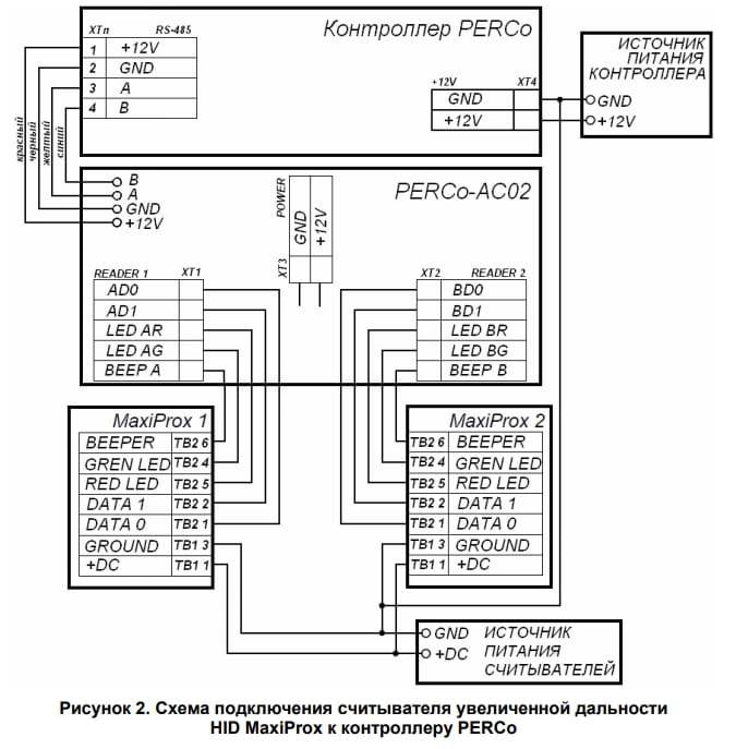 Схема подключения считывателей увеличенной дальности HID MaxiProx к контроллеру PERCo с помощью конвертера приведена на рисунке 2.