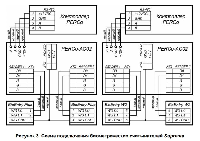 Схема подключения биометрических считывателей Suprema к контроллеру PERCo с помощью конвертера приведена на рисунке 3: