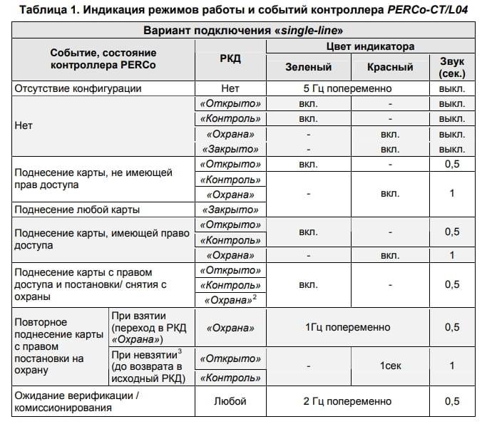 1 При подключении к другому типу контроллера PERCo индикация на подключенных через конвертер считывателях будет аналогичной, но с учетом особенностей данного типа контроллера. 2 При предъявлении в РКД «Охрана» карты доступа, имеющей право снятия с охраны, происходит снятие ОЗ, включающей ИУ, с охраны и разблокировка ИУ на Время удержания в разблокированном состоянии. По истечении этого времени ИУ переходит в РКД, установленный до взятия ОЗ на охрану («Открыто» или «Контроль»; если предыдущий РКД был «Закрыто», то в РКД «Контроль»). 3 Звуковая и световая индикация включается на 1 сек.