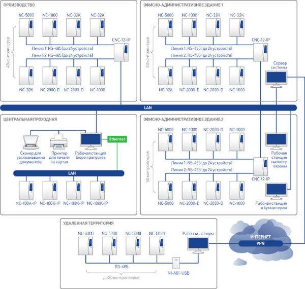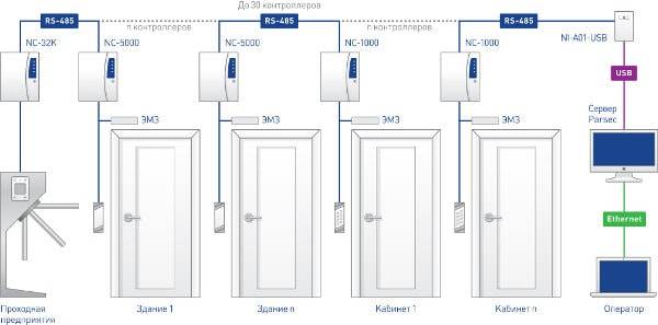 В данном случае система контроля доступа физически представляет из себя набор «линий» оборудования, которые подключаются к управляющему компьютеру с помощью того или иного интерфейса связи (NI-A01-USB,CNC-08, CNC-02-IP.M, CNC-12-IP). Устройства на линию подключаются последовательно по топологии «шина». Возможно подключение по типу «звезда», но в этом случае резко падают характеристики линии – количество устройств на ней и максимальная длина уменьшаются.
