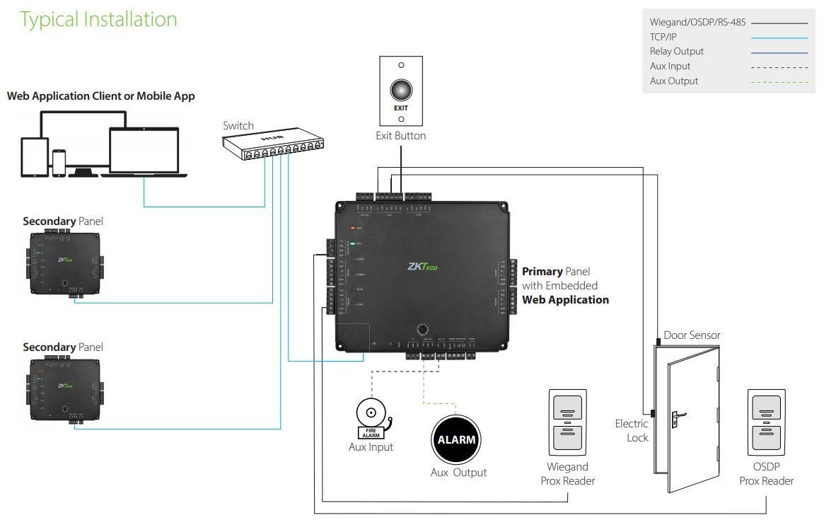 • Типы считывателей: ZKTeco KR Series readers and 3rd party 125kHz & 13.56MHz Wiegand, OSDP and RS-485 readers