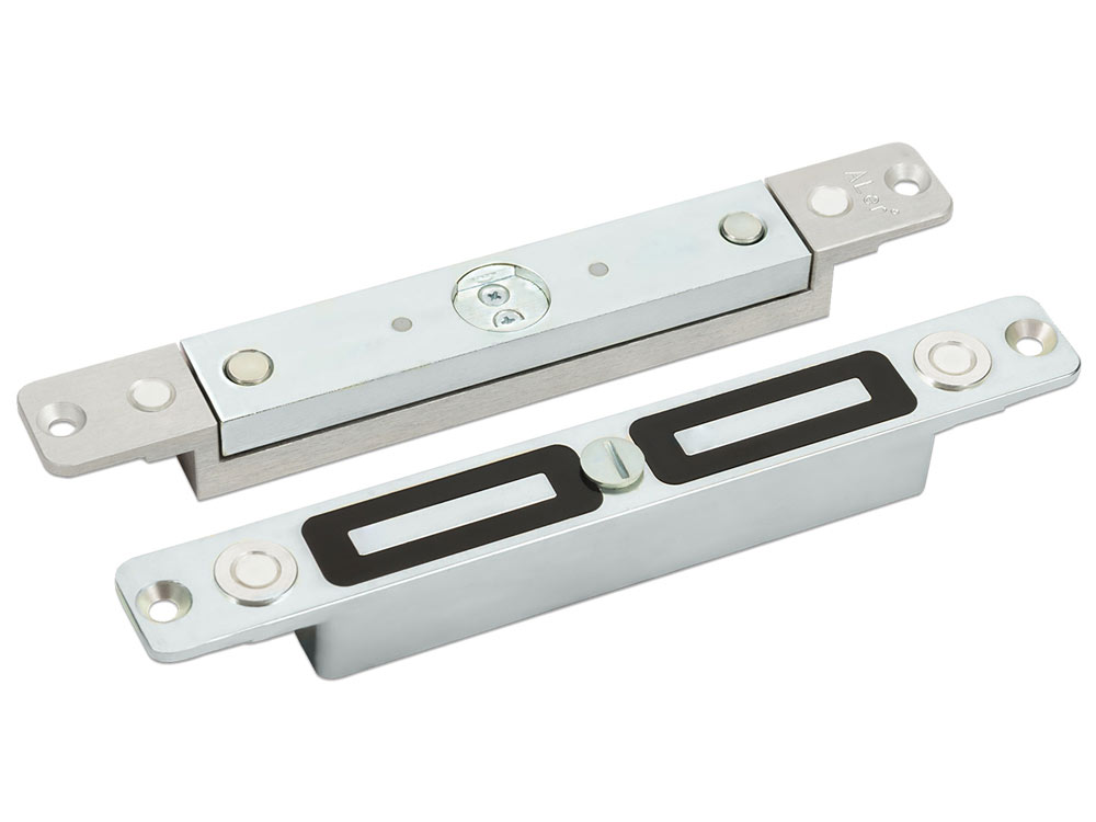 Для монтажа обеих частей замка (якорной и корпусной) на стеклянное полотно необходимо два монтажных комплекта MK AL-400S-Glass.