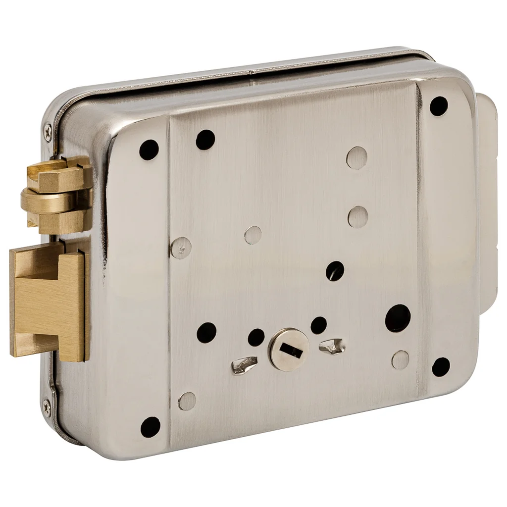 Замок работает от стандартного напряжения питания 12 В и потребляет ток до 3500 мА в импульсном режиме. Он оснащен роликом взвода пружины, обеспечивающим плавную и надежную работу механизма, а также функцией блокировки ключом в закрытом состоянии. Для удобства эксплуатации предусмотрена кнопка выхода, а в комплект входит личинка и пять ключей, что делает использование максимально комфортным и безопасным.