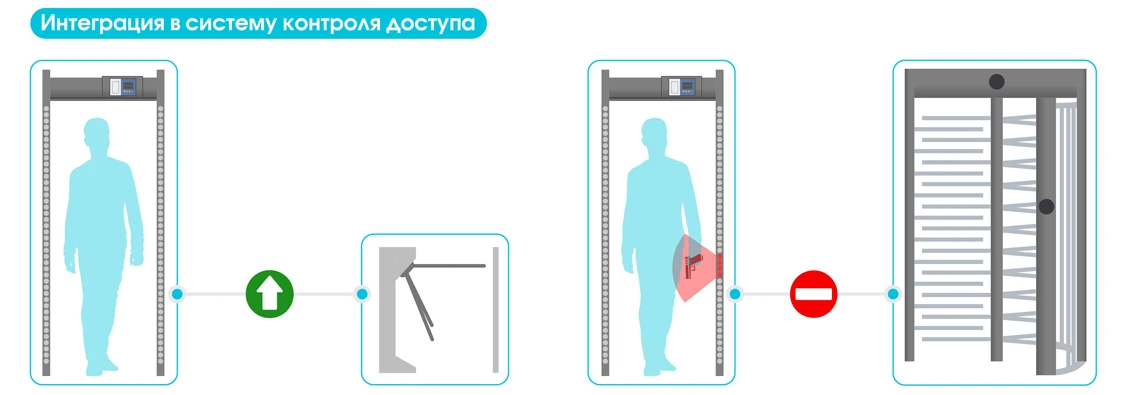 Арочный металлодетектор БЛОКПОСТ "МАТРЁШКА" PC V1 может быть интегрирован в автоматизированную систему контроля доступа (СКУД), что позволяет:- Автоматически блокировать турникеты или шлюзовые кабины при срабатывании детектора.