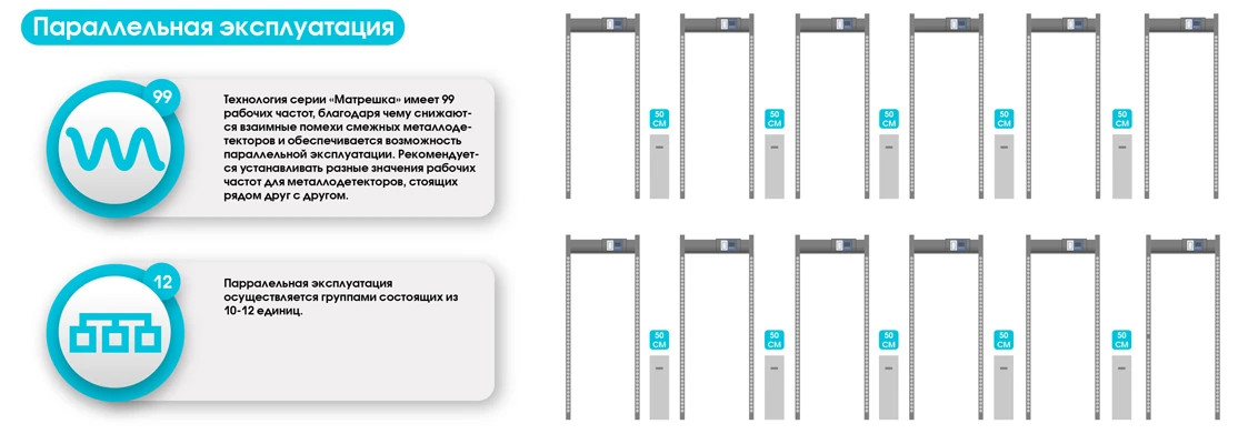 Металлодетекторы БЛОКПОСТ МАТРЁШКА могут работать параллельно, что позволяет организовать многопоточный досмотр. Это особенно актуально для объектов с высокой проходимостью, где необходимо минимизировать задержки при входе.