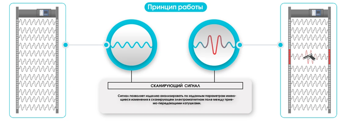 Принцип работы металлодетектора основан на электромагнитных приёмо-передающих катушках, размещённых в антенных панелях. Они создают равномерное сканирующее поле без «слепых зон», обеспечивая точное определение местонахождения металлических предметов. При изменении электромагнитного поля детектор анализирует сигнал и мгновенно выдает тревожное оповещение со световой и звуковой индикацией. Чувствительность системы регулируется в широком диапазоне — от минимального до профессионального уровня, что позволяет адаптировать прибор под конкретные условия эксплуатации.