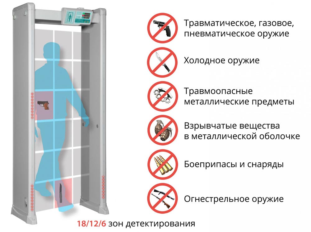 Многозонный металлодетектор имеет возможность точно определить местонахождение одного или нескольких металлических предметов на теле человека. Благодаря этому, уменьшается время досмотра и повышается его точность и эффективность.
