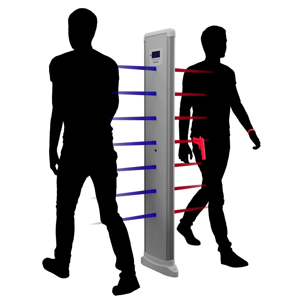 Двусторонняя архитектура обеспечивает полный контроль пространства до 700 мм в каждую сторону от панели. Горизонтальные лучи (красные и синие) перекрывают всю зону обнаружения, позволяя уверенно фиксировать металлические предметы на теле человека, вплоть до точной локализации по высоте. Световая индикация дублируется с обеих сторон корпуса, а звуковой сигнал предупреждает оператора о тревоге. Конструкция отличается высокой помехоустойчивостью и может изготавливаться во всепогодном исполнении.