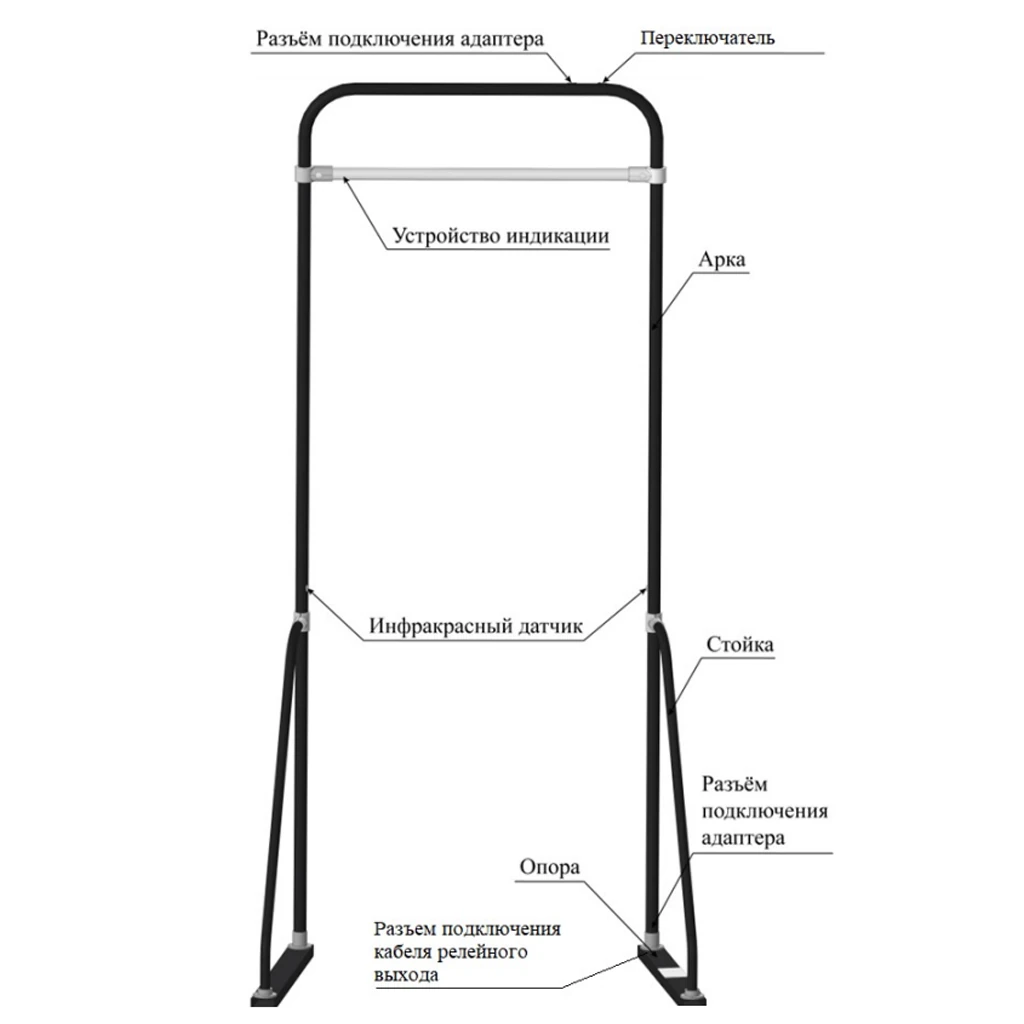 Металлодетектор выполнен в виде двух стоек, внутри которых размещены датчики и элементы обработки сигнала. Система обеспечивает многоступенчатую настройку чувствительности, автоматическую самодиагностику и визуально-звуковое оповещение о тревоге. Встроенный блок управления контролирует состояние каналов, защищён паролем и поддерживает стабильную работу в течение полного времени эксплуатации. Конструкция рассчитана на стационарное размещение и допускает использование в широком температурном диапазоне.