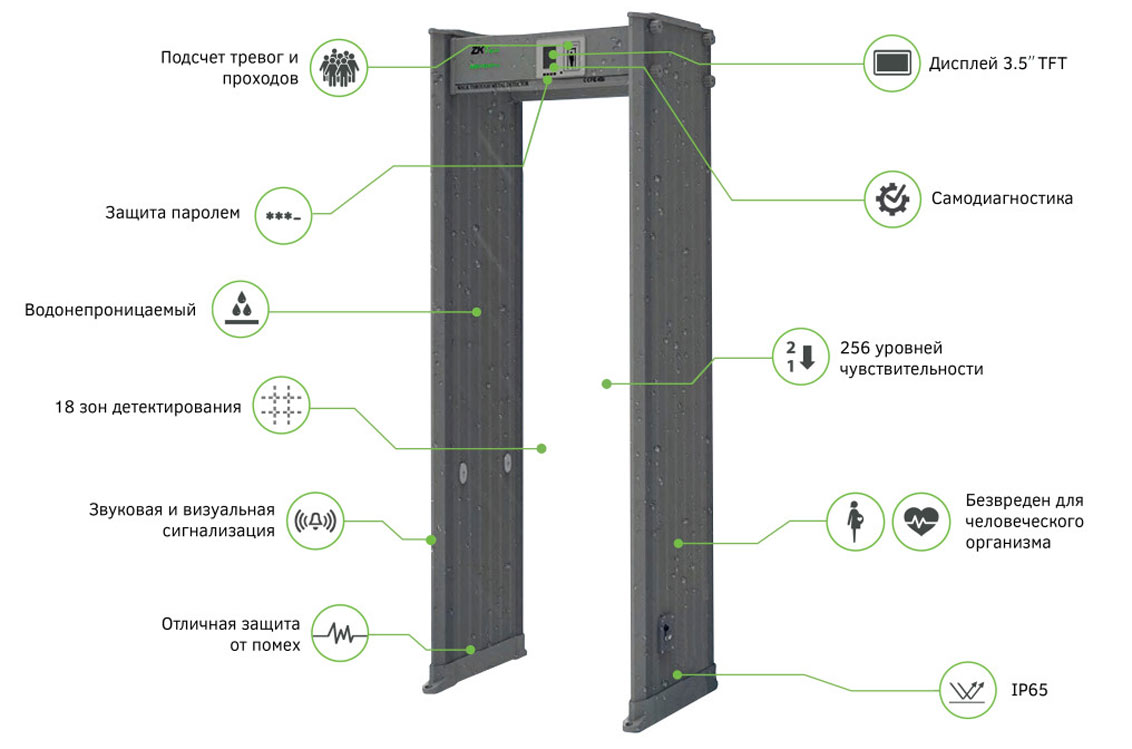 Арочный металлодетектор ZKTeco AMD1800 Pro. 18 зон детектирования, IP65: полная пыленепроницаемость и защита от влаги, звуковой и светодиодный сигнал тревоги, 256 уровней чувствительности, 3,5-дюймовый ЖК-дисплей, TCP/IP-связь, дистанционное управление через приложение WTMD.