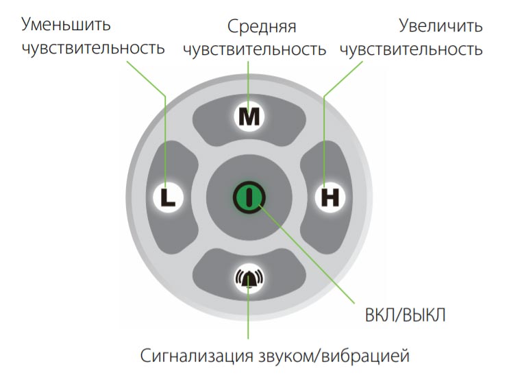 чувствительность имеет 4 уровня; низкий, средний, высокий и супер высокий. Выберите низкую, среднюю или высокую чувствительность, нажав соответствующую кнопку чувствительности, соответствующий индикатор мигает один раз в 3 секунды. Чтобы переключиться на сверхвысокую чувствительность, нажмите на кнопку высокой чувствительности дважды, три индикатора чувствительности не должны мигать.