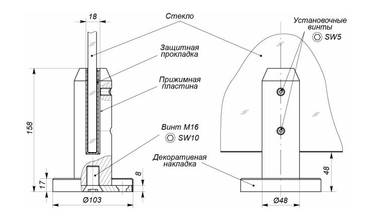 4. Возьмите одну из мини-стоек. Ослабьте винт М16 крепления фланца стойки (инбуcовым ключом SW10) и, временно зафиксировав стойку в отверстиях по месту ее установки, отрегулируйте необходимое положение паза стойки в направлении установки стекла ограждения. Снимите стойку и, затянув винт, зафиксируйте это положение.