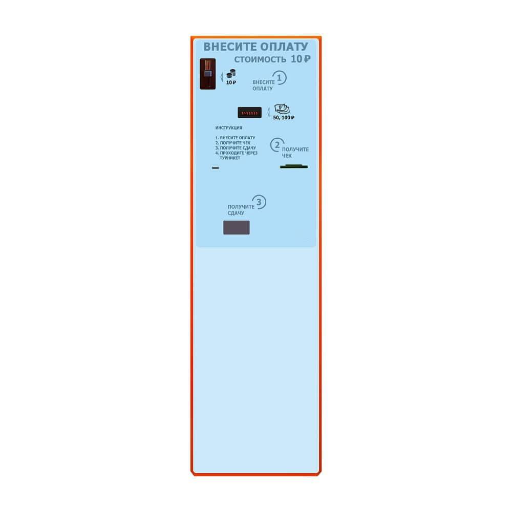 Стойка оплаты всегда находится в активном режиме, о чем свидетельствует зеленая подсветка на купюроприемнике. Посетитель подходит к стойке оплаты, вносит требуемую сумму доступными методами (купюрами или наличными), получает чек об оплате. Сразу после завершения оплаты на турникете загорается зеленый сигнал, и посетитель может проходить.