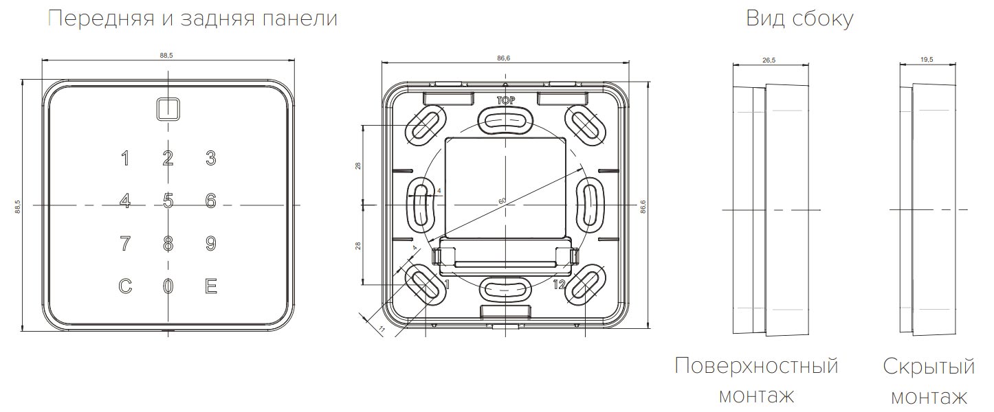 • Вариант монтажа AP (монтажная рамка): 88,5 x 88,5 x 46,5 мм (ширина x высота x глубина)