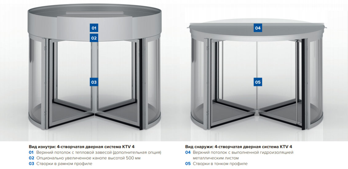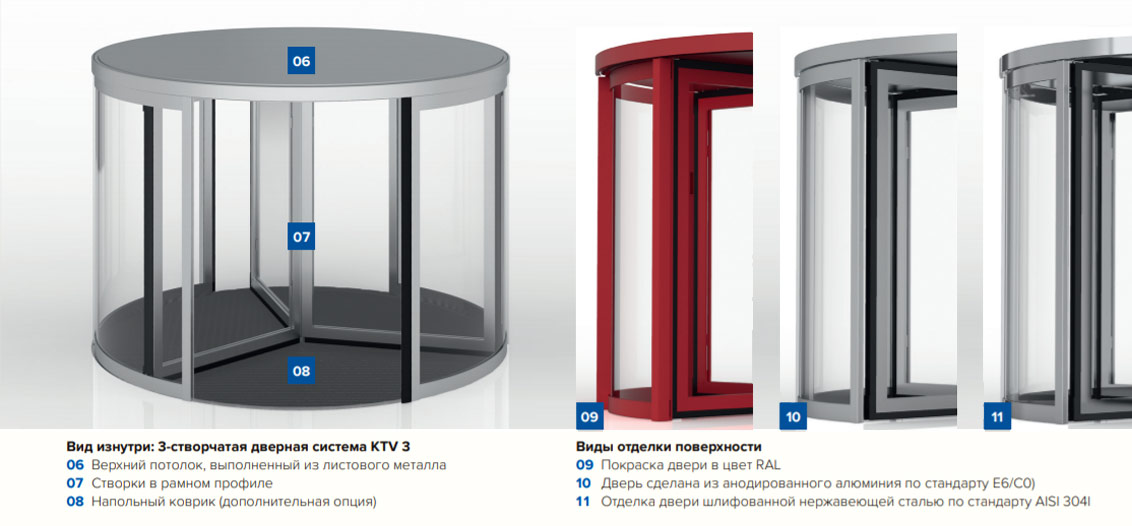 • KTV-S - Полуавтоматическая карусельная дверь, начинающая медленно вращаться от датчиков движения, при этом вручную можно ускорить вращение до необходимой скорости