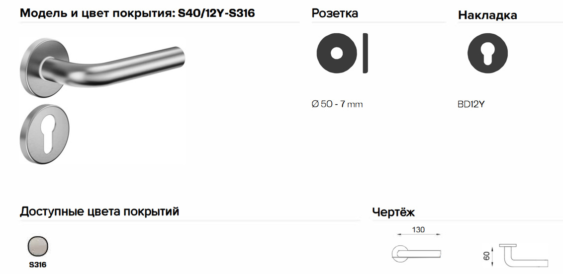 • S40/12Y с накладкой под евроцилиндр, 38-55 мм, шп. 8 мм, нерж. сталь S316 (8010814)