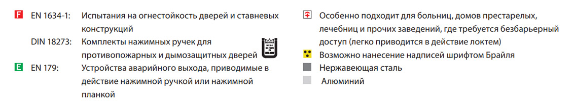 • Одобрено для аварийных выходов EN 179:2008: зависит от дизайна ручки