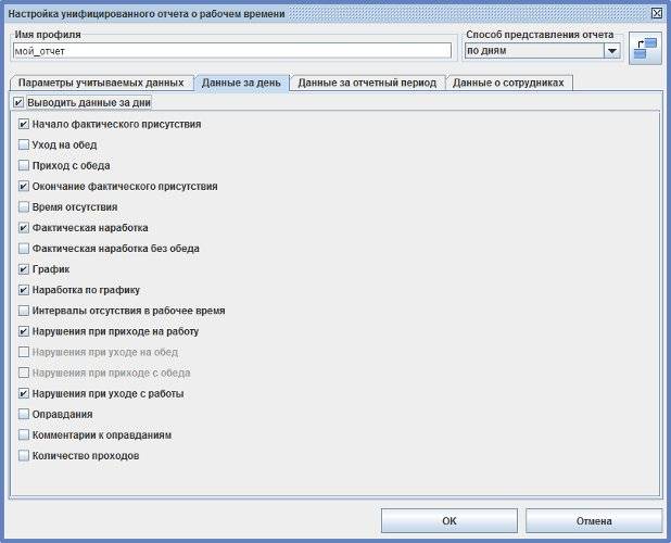 Для создания необходимых отчётов с индивидуальными настройками можно добавлять произвольное количество профилей. Также в профиле настраивается способ представления отчёта: по сотрудникам, по датам, отделы по алфавиту, отделы по вложенности.