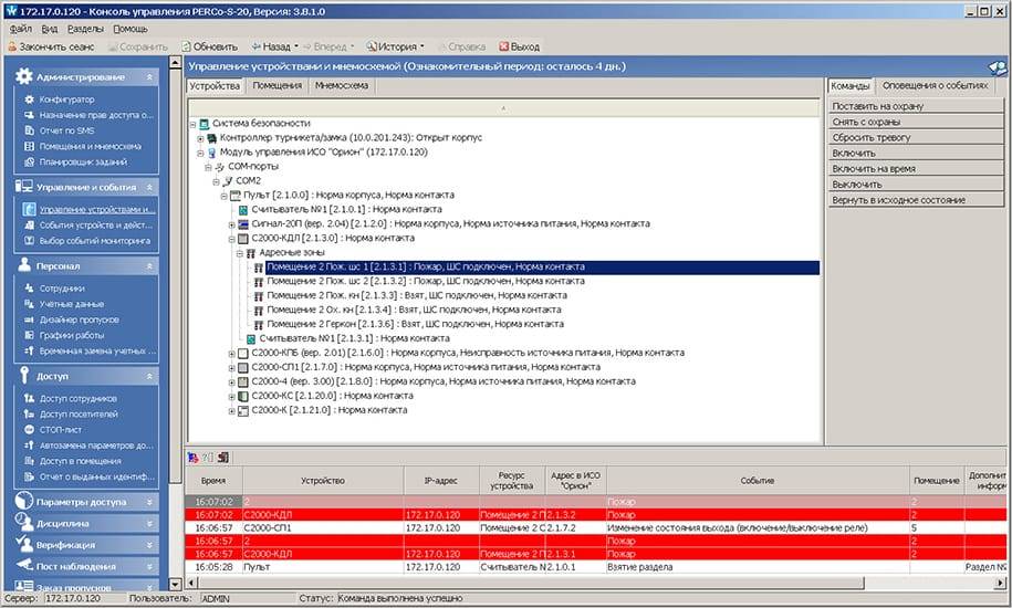 Возможность непрерывного контроля охранно-пожарной обстановки с ее визуализацией на мониторе сотрудника безопасности и оперативного реагирования на нештатные ситуации реализуется в разделе S-20 «Центральный пост охраны».