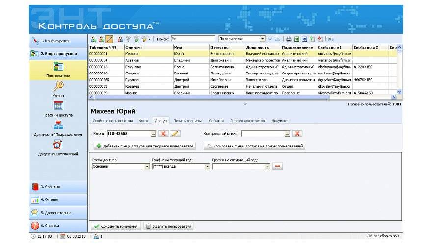 В программе ведётся список сотрудников и ключей, есть возможность создавать различные графики прохода (до 200 шт.) для разных групп сотрудников. Так же ведётся учёт рабочего времени. Есть возможность мониторинга проходов и фотомодуль. Так же существует несколько небольших, но приятных дополнений. Таких ка объединение нескольких точек прохода в одну зону прохода, возможность запрета повторного прохода, автоматическая рассылка сотрудникам отчёта по их времени пребывания на работе и пр.