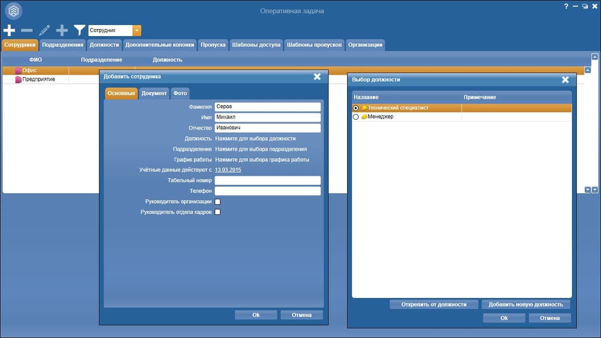 Просмотр графических планов, взаимодействие с элементами графических планов (открыть/закрыть дверь и т.п.), просмотр журнала событий в реальном времени и в архиве, построение простых отчетов (список точек доступа, отчет по событиям системы, сведения о пропусках, список подразделений, список должностей, права и графики доступа), заведение пропусков сотрудников, присвоение сотрудникам графиков доступа/шаблонов доступа.