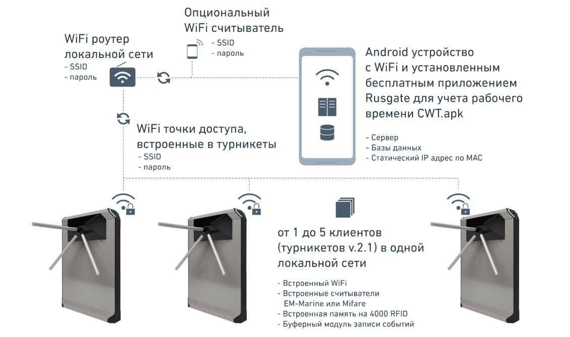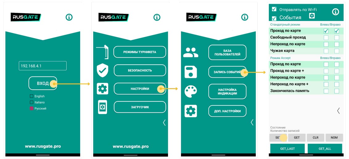 11. Используем Android устройство с установленным приложением Мастеркард. Подключаемся по WiFi напрямую к каждому турникету. В меню Вход -> Настройка -> Запись событий -> Поставить галочки Запись событий, Проход по карте вправо и влево, отправлять по WiFi.