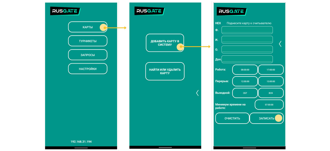 Через меню Карты-Добавить карту в систему выполняем запись карт в базу данных. Турникеты должны быть предварительно настроены. Прикладываем карту к левому считывателю турникета (или к выносному считывателю при его наличии), индикация считывателя кратковременно изменится и номер карты отобразится в приложении CWT. Если номер не отображается, приложите быстро карту от 2 до 3 раз подряд.