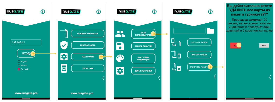 Перед тем как выполнить процедуру очистки памяти проверьте наличие установленного пароля в меню Вход -> Безопасность -> Использовать пароль для связи с турникетом (по умолчанию пароль: 12345678)