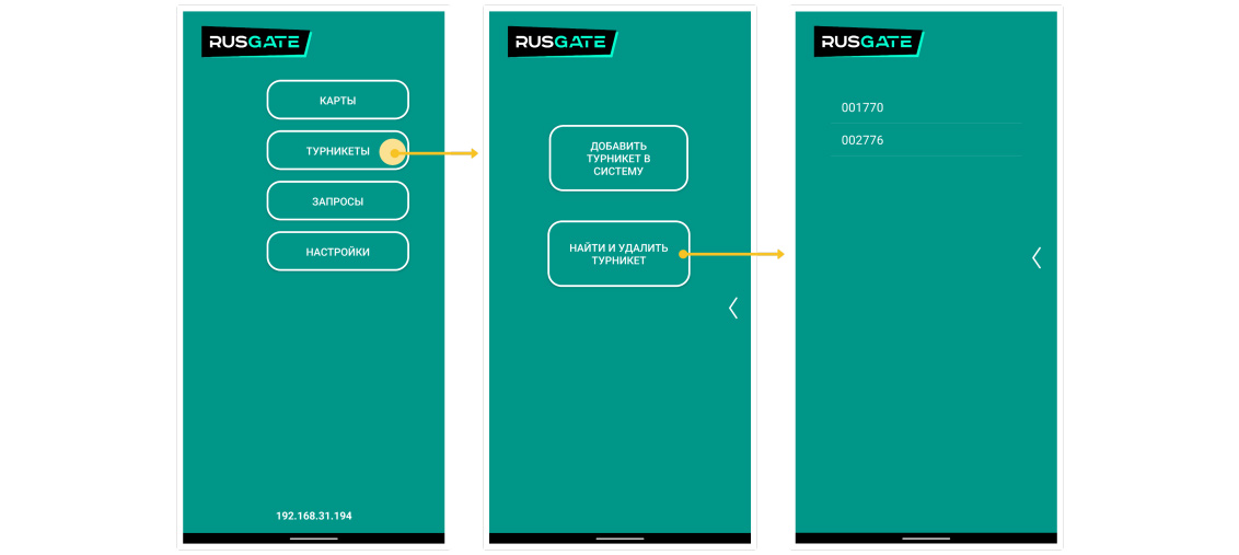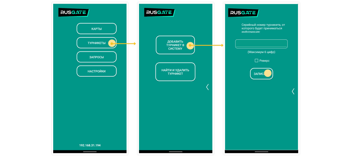8. Убедитесь в наличии WiFi соединения между роутером и серверным Android Устройством. Запустите Приложение CWT на серверном Android устройстве. Убедитесь что на стартовой странице приложения отображается правильный IP адрес (который был записан в роутере для данного устройства как статический). Добавляем ранее записанные в п.2 номера турникетов в систему через Меню-Турникеты-Добавить турникет в систему. При необходимости изменить направление входа установите чекбокс Реверс. Встаньте лицом к турникету между двумя стрелками индикации со стороны где установлены планки - входом считается движение от левой стрелки к правой.