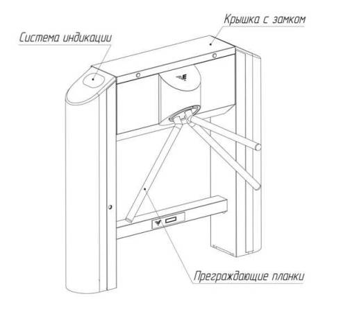 Корпус турникета и преграждающие планки выполнены из шлифованной нержавеющей стали. Конструкция турникета имеет в своем составе интегрированный картоприемник. В верхней части корпуса имеется съемная крышка с замками для быстрого доступа к кросс-плате, при подключении кабелей БП, ПУ и СКУД. В стойках расположены отверстия для ввода кабелей. Находятся за дверками картоприемника, либо стойками турникета.