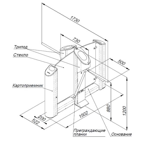 Корпус турникета и преграждающие планки выполнены из шлифованной нержавеющей стали. Элементы ограждения выполнены из закаленного стекла. Конструкция турникета имеет в своем составе интегрированный картоприемник. В средней части корпуса имеются съемные дверцы с замком для быстрого доступа к кросс-плате при подключении кабелей БП, ПУ и СКУД. В нижней части корпуса имеются отверстия для ввода кабелей и крышка основания, скрывающая крепление турникета к полу.