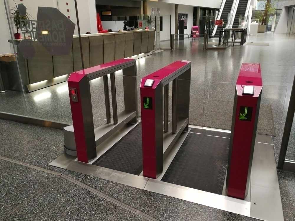 Gotschlich Axioma VIP – полуростовой сенсорный турникет из нержавеющей стали матовой полировки с распашными створками и панелями, выполненными из акрилового стекла.