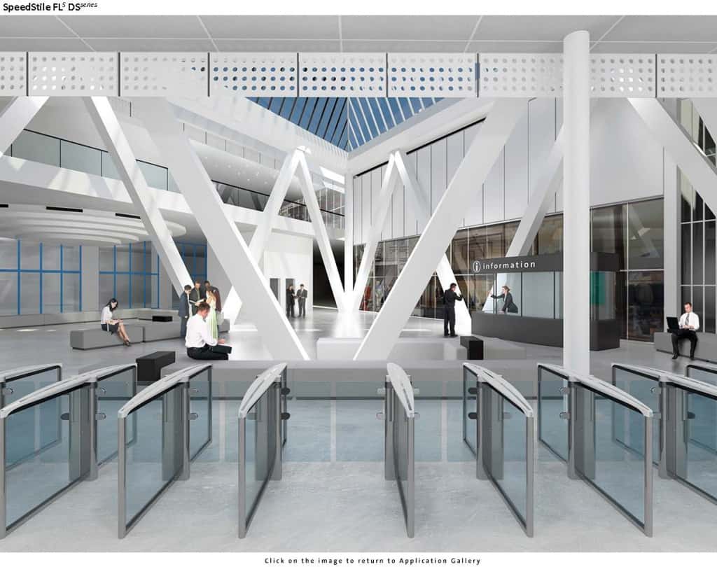Турникеты с распашными створками SpeedStile FLS отличаются корпусом шириной 12 см с центральной секцией из 10 мм закаленного стекла.