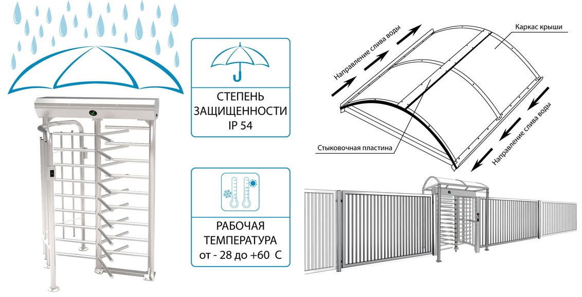 При использовании полноростового турникета РСТ 700 на открытом воздухе необходимо использовать защитный навес (приобретается отдельно). Такие меры предосторожности предохраняют турникет от прямого воздействия влаги и различных атмосферных осадков, обеспечивая долгосрочную стабильную работу устройства. Эксплуатация крыши допускается при температуре окружающего воздуха от -40°С до +60°С и влажности воздуха до 90%.